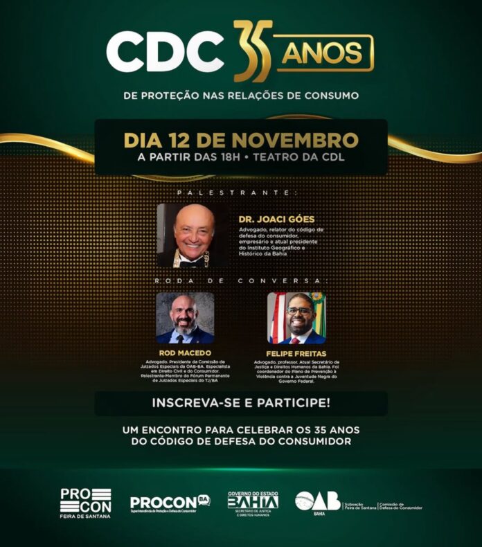 A Comissão de Defesa do Consumidor da OAB Subseção Feira de Santana, o Procon Municipal e o Procon Bahia vão celebrar os 35 anos do Código de Defesa do Consumidor (CDC). O evento acontecerá no próximo dia 12 (quarta-feira), a partir das 18h, no Teatro da Câmara de Dirigentes Lojistas (CDL) em Feira de Santana.