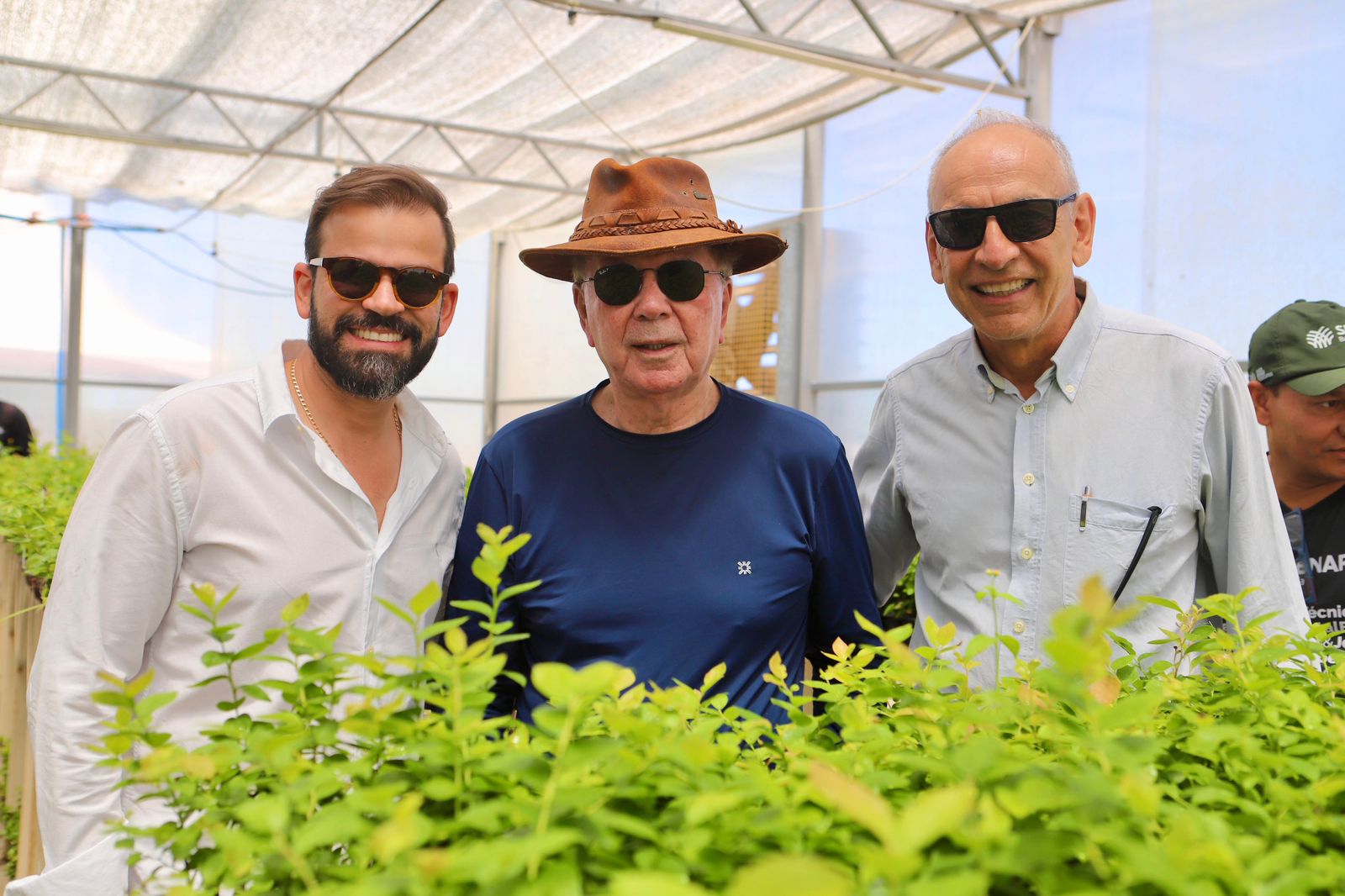 Marco Caviola, Nil de Joaquinzinho, produtor rural de Barra, recebendo as mudas de mirtilo e o engenheiro agrícola Nelson Meira