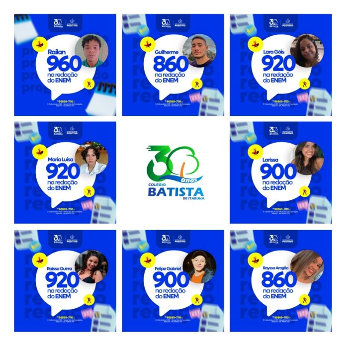 Em mais um ano, alunos do Colégio Batista de Itabuna (CBI) se destacaram no Exame Nacional do Ensino Médio. Na edição de 2023, que teve resultado divulgado, nesta terça-feira (16), pelo Instituto Nacional de Estudos e Pesquisas Educacionais Anísio Teixeira (Inep), vários alunos do CBI obtiveram notas altas em Redação, o que foi comemorado por estudantes, pais, professores e direção do Colégio, um dos mais tradicionais do sul da Bahia.
