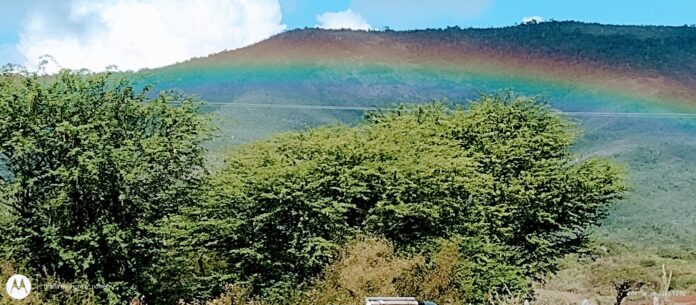 O arco-íris é um arco multicolorido, composto de sete cores, causado pelo fenômeno óptico que, através da refração (dispersão) da luz solar sobre as gotas de água suspensas no ar, forma um espectro de luzes ou cores.
