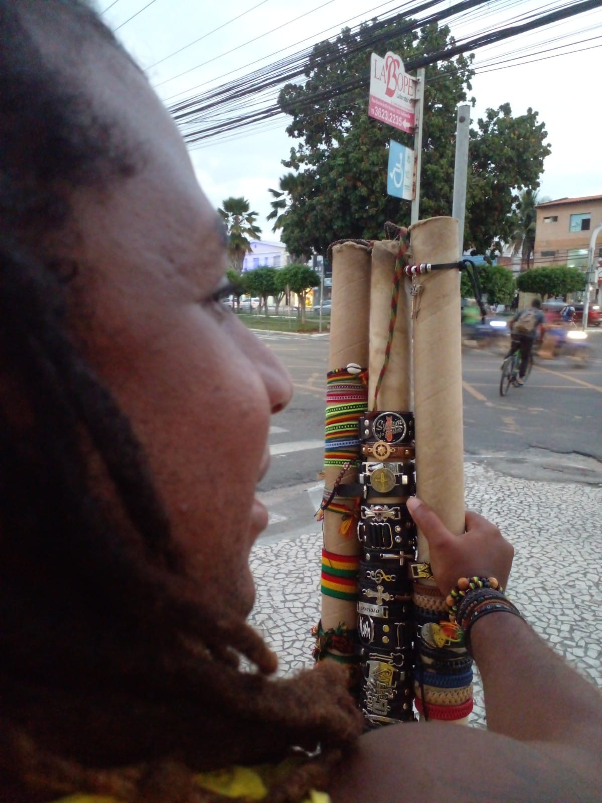 Morador do Alto do Rosário, o jovem popularmente conhecido como o Rasta das Pulseiras, há dez anos desenvolve essa rotina pelas ruas do Centro da Cidade e não se envergonha de cumprir essa missão sempre caminhando. Rapaz! Eu caminho todo o Centro de Feira. Bato uma paleta sem noção de quilometragem. Só pego o buzu na hora de ir para casa. Isso quando dá certo! Quando não dá (não vende), vou batendo paleta”.