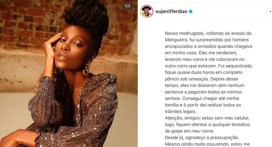 A atriz Jennifer Dias, de 31 anos, usou as redes sociais para revelar que foi vítima de um sequestro, na madrugada deste domingo. Em postagem no Instagram, a artista relatou os momentos de “pânico” que viveu ao ser abordada por bandidos quando chegava em casa ao retornar do ensaio na quadra da escola de samba Estação Primeira de Mangueira, na Zona Norte do Rio.