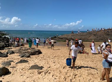 Mesmo com bloqueio em praia, fiéis garantem presentes para Iemanjá