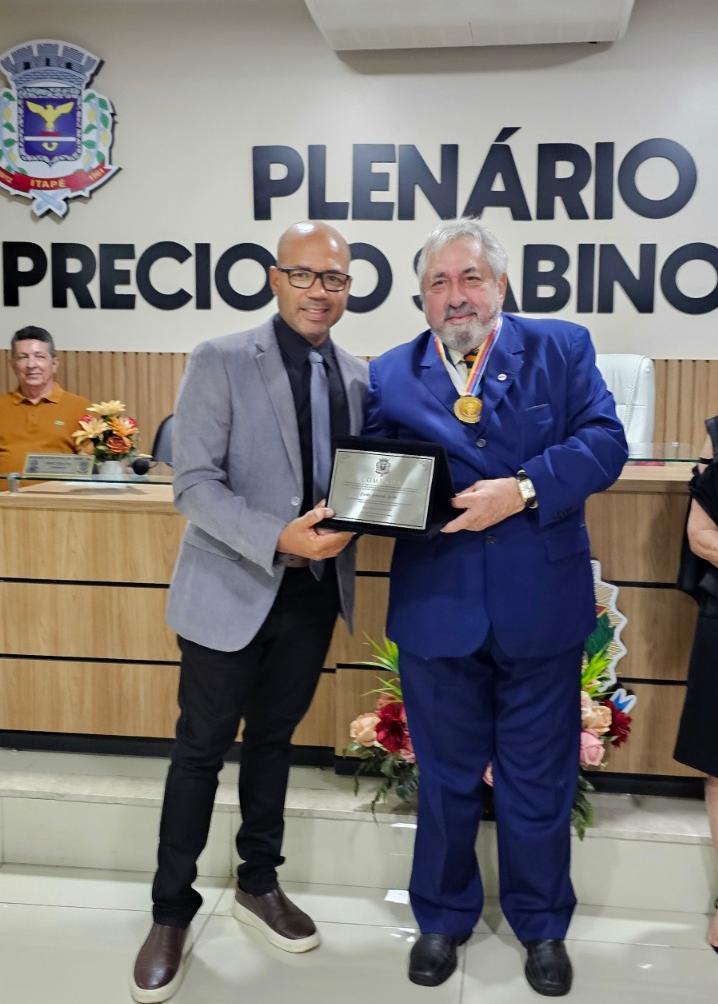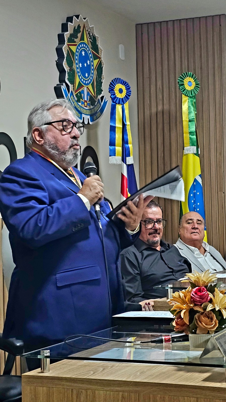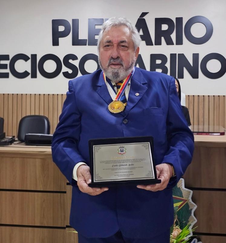Durante a sessão solene, conduzida pela presidente do Poder Legislativo, vereadora Ive Clélia Alves Pinto de Almeida, Sodré recebeu a Comenda pelas mãos de seus familiares e se emocionou.