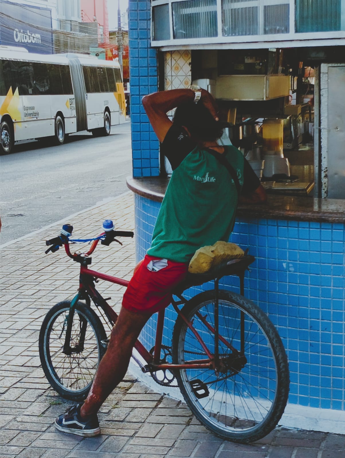 A imagem do cavaleiro pedalando — e fazendo uma pausa no tradicional ponto de encontro — demonstra a flexibilidade de um indivíduo que se recusa a ser limitado por desafios, transformando sua rotina em uma discreta, mas poderosa, demonstração de força e persistência.