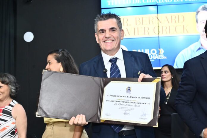 O cônsul Honorário da França em Salvador, o cirurgião-dentista e professor universitário Bernard Xavier Greck, recebeu o título de cidadão soteropolitano por suas contribuições sociais à Bahia nesta quinta-feira, 16, em Salvador. Em seu discurso, o terceiro francês a receber a mais alta honraria da Câmara Municipal de Salvador desde 1980, afirmou que escolheu a capital baiana para construir sua família e trajetória profissional.