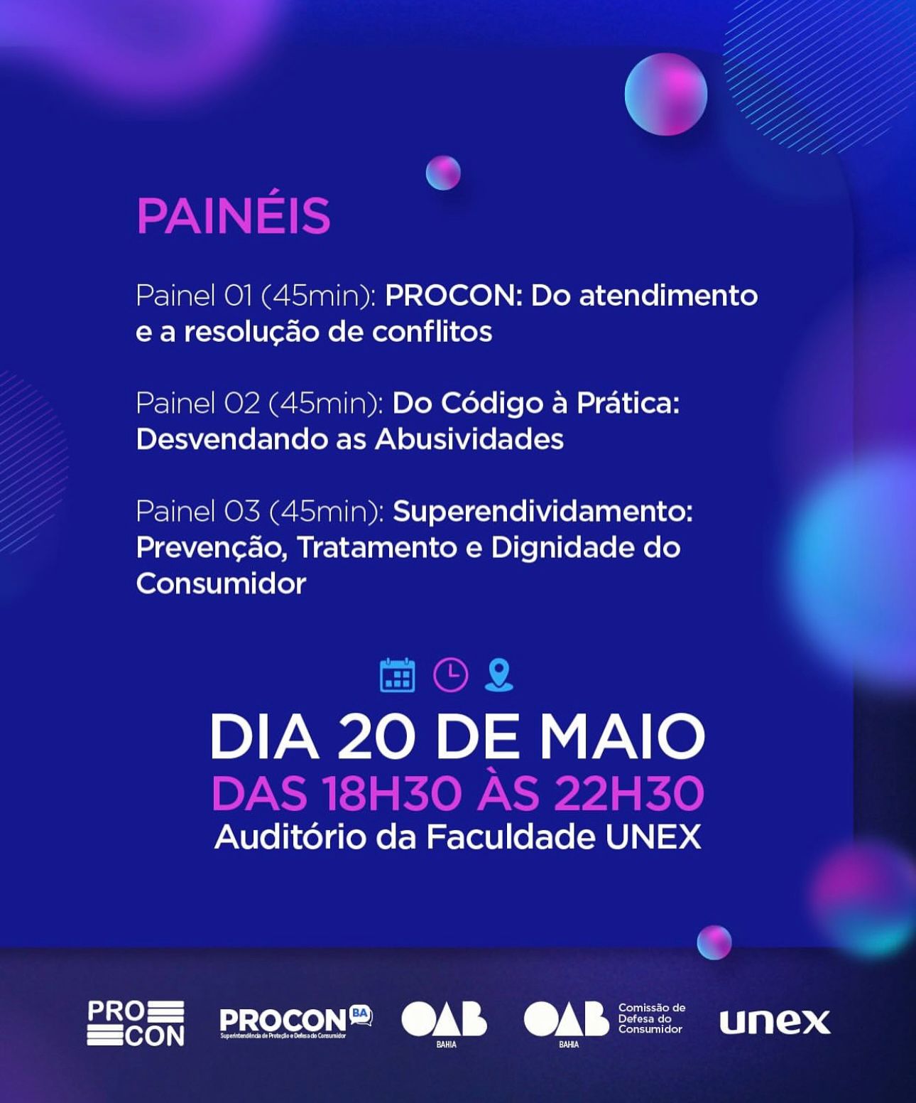 O auditório da UNEX será palco, na noite desta terça-feira (20), de um evento intitulado “Conexão PROCON e OAB pelo Direito do Consumidor”. Organizado pelos órgãos citados, especialmente a Comissão de Direito do Consumidor da OAB Feira, o evento será dividido em três painéis que discutirão temas como “atendimento e resolução de conflitos” e “desvendando as abusividades”.