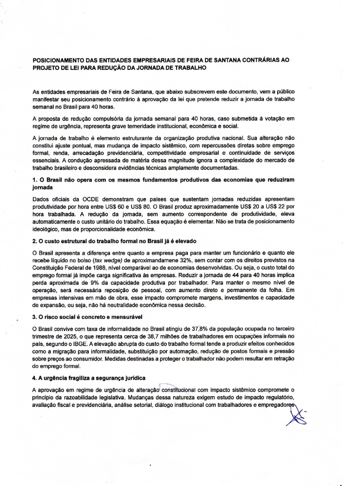Documento assinado por diversos setores alerta para riscos econômicos, aumento da informalidade e perda de competitividade com a proposta de 40 horas semanais.