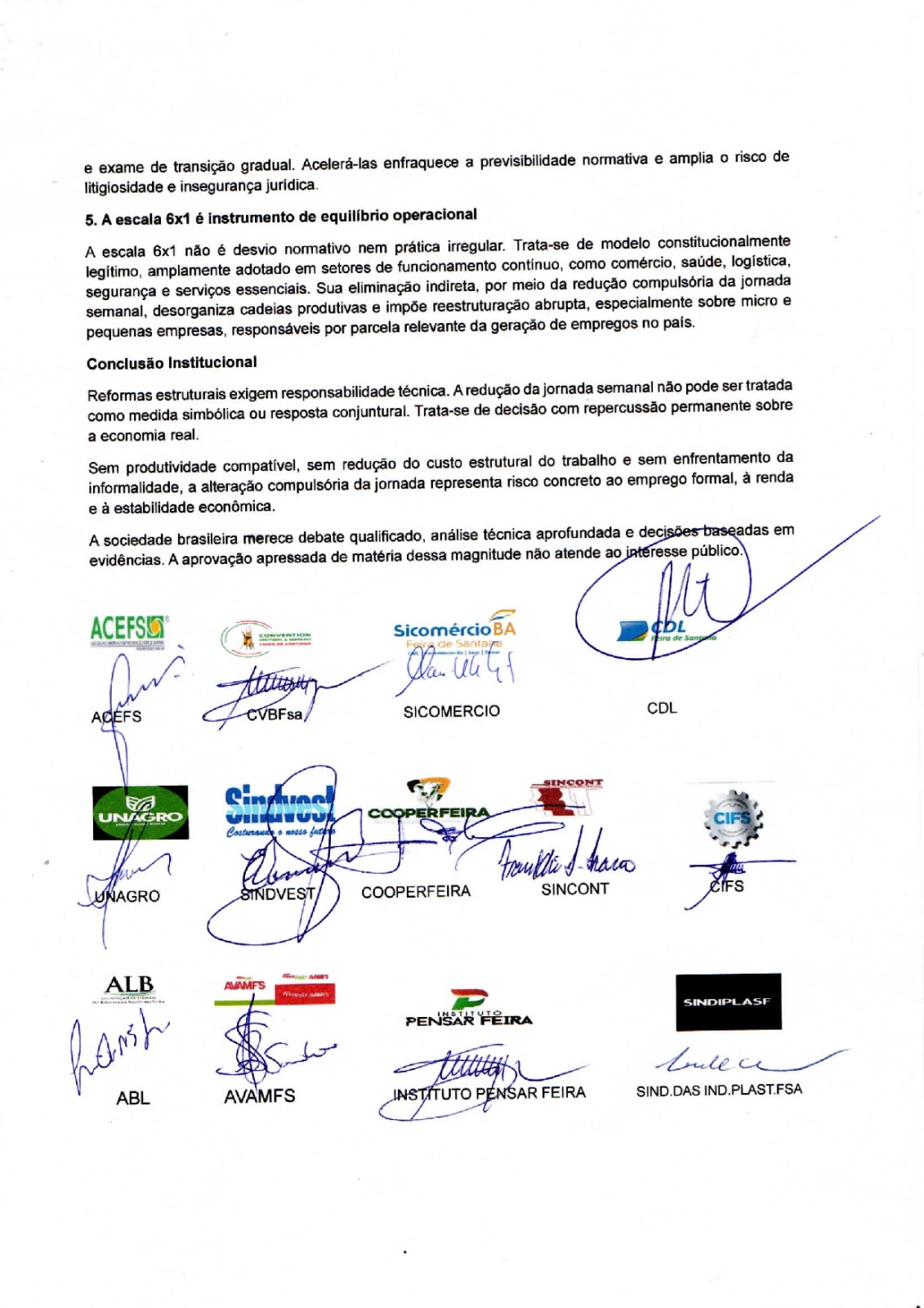 ​A nota destaca que a mudança não deve ser tratada como uma medida simbólica, pois impacta diretamente setores de funcionamento contínuo como comércio, saúde e logística. As instituições reforçam que a escala 6×1 é um instrumento de equilíbrio operacional e que sua alteração compulsória pode desorganizar cadeias produtivas, afetando especialmente micro e pequenas empresas. O texto conclui que, sem o devido enfrentamento da informalidade e uma análise técnica aprofundada, a redução da jornada representa um risco concreto à manutenção do emprego formal e à estabilidade da economia brasileira.