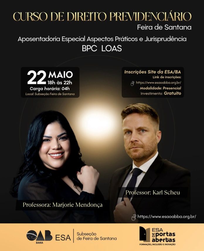 A ESA (Escola Superior da Advocacia), em parceria com a OAB Subseção de Feira de Santana, vai realizar um curso presencial sobre Direito Previdenciário nesta quinta-feira (22), das 18h às 22h, no auditório instituição.