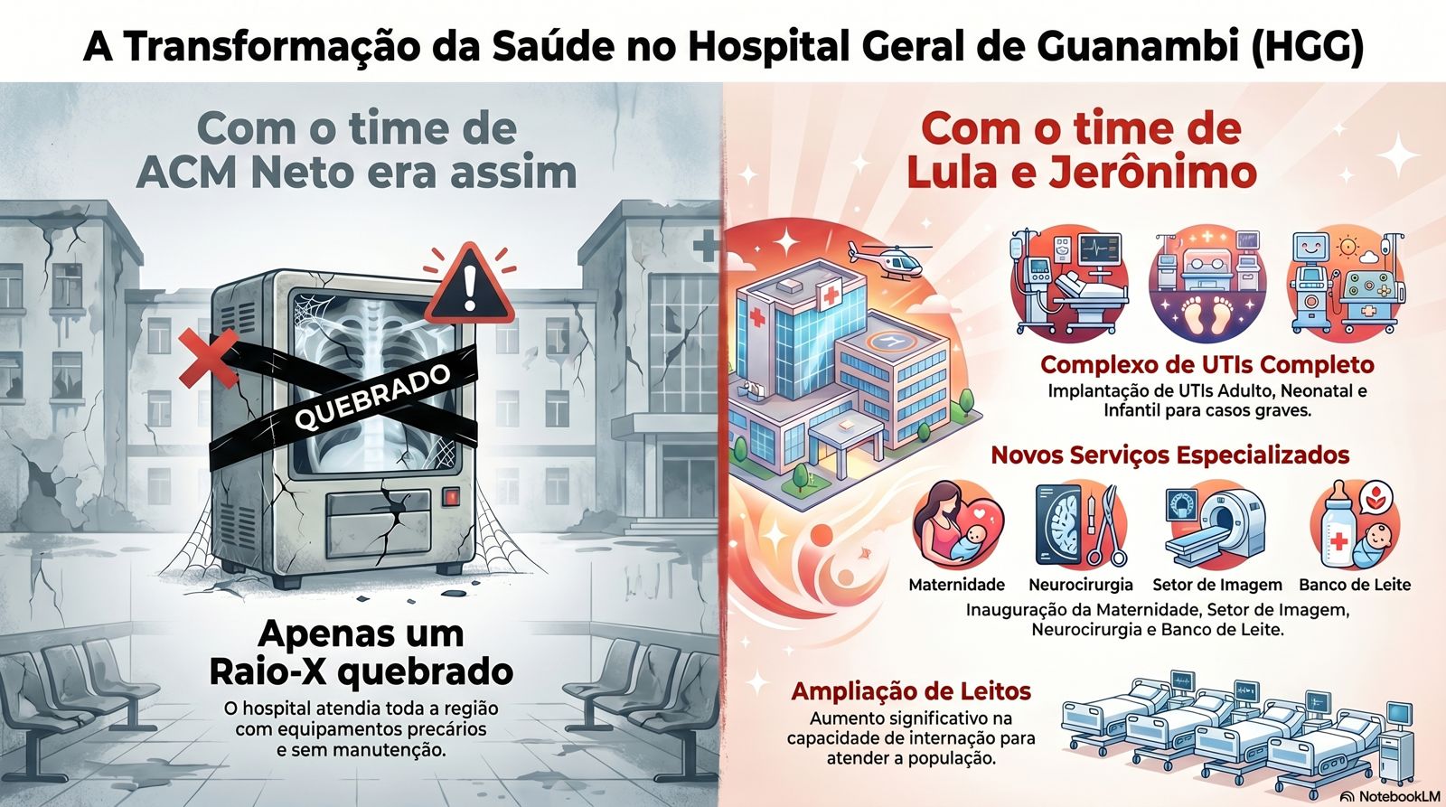 A realidade é objetiva: o Hospital Geral de Guanambi existe há quase 30 anos. Inaugurado em 27 de julho de 1998, o equipamento é referência no atendimento regional. Portanto, não há qualquer lógica na alegação de promessa não cumprida, já que se trata de uma estrutura consolidada e em pleno funcionamento.