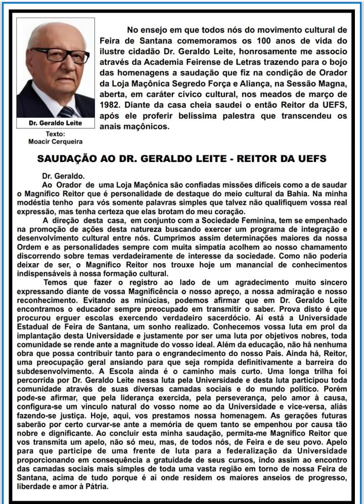 A importância de Geraldo Leite ultrapassa os muros da academia. Como destacado pelo escritor Moacir Cerqueira em homenagens da Academia Feirense de Letras, o médico sempre foi visto como uma liderança que uniu diversas camadas sociais e políticas em prol de um objetivo nobre: romper as barreiras do subdesenvolvimento através do ensino.