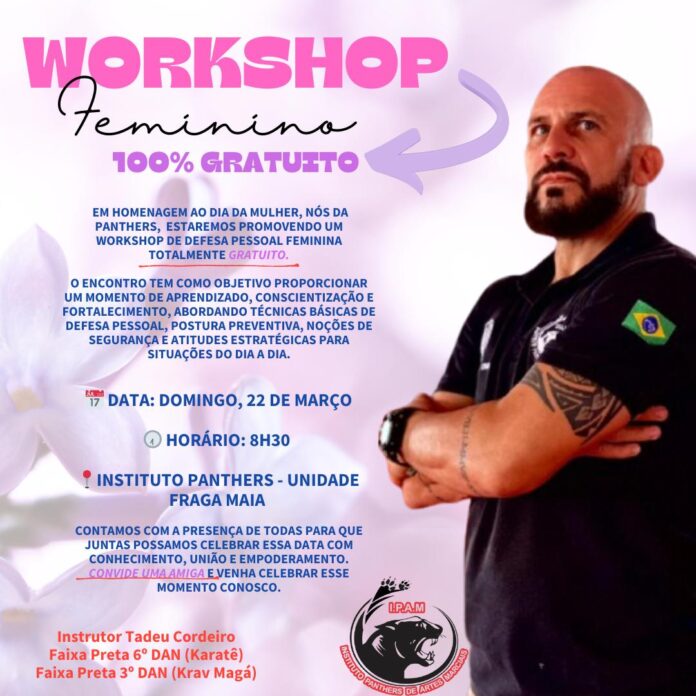 Em homenagem ao Dia Internacional da Mulher, o Instituto Panthers realiza, no próximo domingo (22 de março), um workshop de defesa pessoal totalmente gratuito voltado para o público feminino. O evento será realizado na unidade Fraga Maia, às 8h30, sob o comando do experiente instrutor Tadeu Cordeiro, Faixa Preta 6º DAN de Karatê e 3º DAN de Krav Magá.