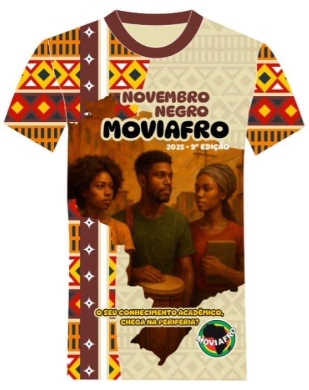 O Movimento de Valorização e Ascensão Afro-Brasileira (MOVIAFRO) lança a camiseta da sua 9ª Edição do Novembro Negro em 2025, um marco na luta pela equidade e acesso ao conhecimento. A peça, que traz a estampa “Novembro Negro MOVIAFRO 2025 – 9ª Edição” e a instigante pergunta “O seu conhecimento acadêmico, chega na periferia?”, carrega a identidade e a missão do projeto, que há quase uma década trabalha incansavelmente na transformação social, especialmente nas comunidades periféricas.