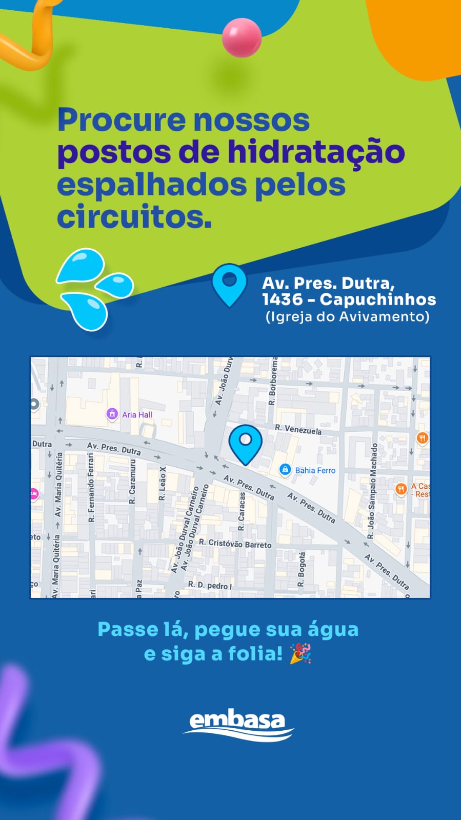 Dois pontos estratégicos estão sendo instalados no circuito Maneca Ferreira, na Avenida Presidente Dutra: *um ao lado da Igreja Santo Antônio (Capuchinhos) e outro próximo à Igreja do Avivamento*. Basta levar a garrafinha e abastecer com água fresquinha para seguir o trio com segurança e disposição. Além dos bebedouros instalados nos pontos, equipes da Embasa farão a distribuição volante de copos de água nos momentos de passagem dos trios elétricos. A ação contará com mais de 30 trabalhadores atuando das 15h às 0h, em todos os dias da festa.