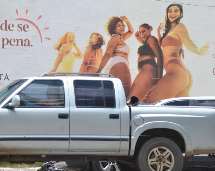 A composição da foto que envolve o outdoor e o veículo, logo nos remete a famosa frase, é muita areia para um (seu, o) caminhão. Avenida Presidente Getúlio Vargas, Ponto Central, Feira de Santana, Bahia.