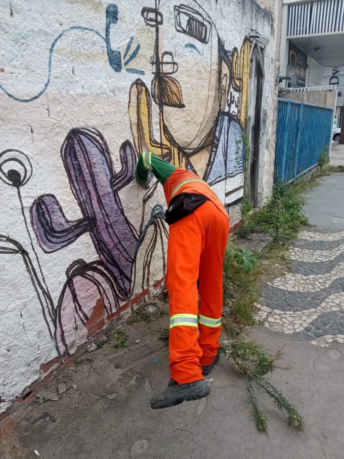 Entretanto, a lente atenta de Luiz Tito – Digai Feira capturou o exato instante em que a arte urbana subverte a botânica e o preconceito. Entre traços de tinta e a poeira da calçada, um trabalhador de limpeza urbana, vestindo seu laranja vibrante, curvou-se para encontrar um repouso improvável no desenho de um cacto. Não era apenas um encosto físico, mas um diálogo silencioso entre quem cuida da cidade e a imagem daquilo que melhor define a resiliência do povo sertanejo.