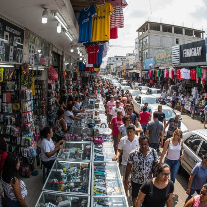 O mercadejar extrapola boxes e corredores, irradia-se para além do quarteirão que abriga aquele frenesi. Nas vias limítrofes vicejam lojas, dezenas de lojas que oferecem uma amplitude de mercadorias ainda maior: os mesmos eletrônicos, utilidades domésticas, brinquedos e artigos infantis, produtos de limpeza e organização, além de itens de beleza.