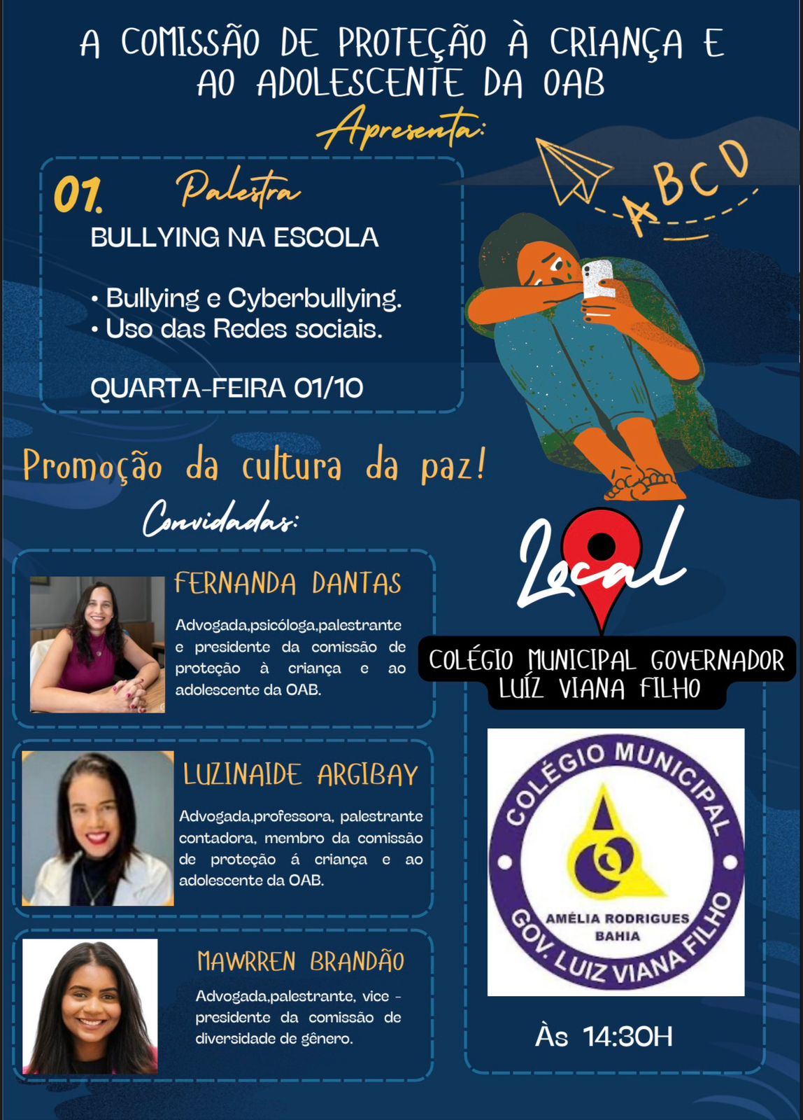 A Comissão de Proteção à Criança e ao Adolescente da OAB Subseção Feira de Santana vai dar continuidade à realização de palestras sobre “bullying nas escolas”. Nesta quarta (1º) será realizada uma palestra no Colégio Municipal Governador Luís Viana Filho, em Amélia Rodrigues. As palestras estão tomando proporção e expandindo para outros municípios.