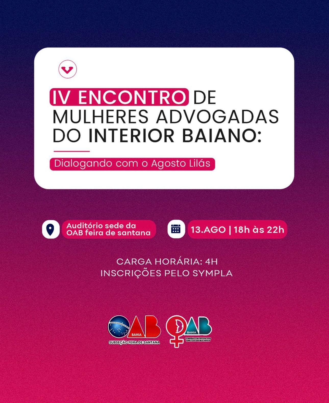 A fim de dar visibilidade e discutir ainda mais a campanha Agosto Lilás, realizada durante todo este mês, será realizado, nesta quarta-feira (13), o IV Encontro de Mulheres Advogadas do Interior Baiano. O evento, organizado pela OAB Subseção Feira de Santana, através da Comissão em Defesa dos Direitos das Mulheres, será realizado no auditório da instituição e comecará às 18h.