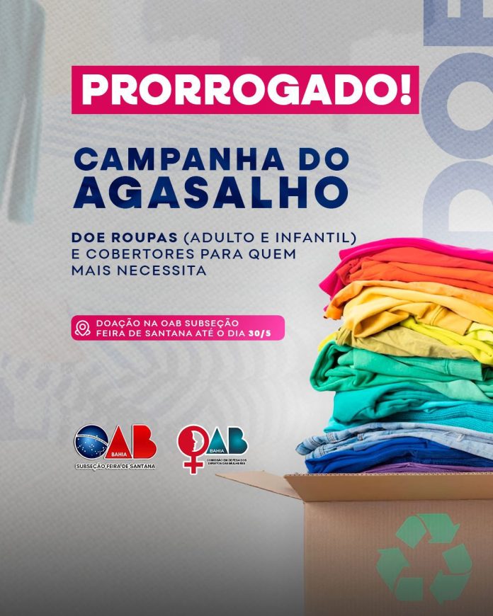 Com o intuito de receber mais doações da Campanha do Agasalho deste ano, a fim de poder ajudar o maior número de pessoas possível, o prazo para recebimento das doações foi prorrogado. A campanha, que é organizada pela Comissão em Defesa dos Direitos das Mulheres – conhecida como OAB Mulher, tem como chamada “quem tem frio não pode esperar”, já que as chuvas que tem caído na cidade, de forma oscilante, nos últimos dias, agravam ainda mais a situação de quem não tem um agasalho ou cobertor pra se proteger do frio.