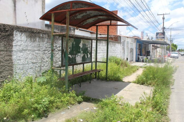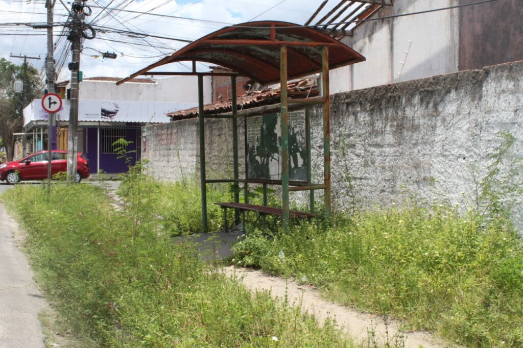 O ponto de ônibus localizado na rua Frei Aureliano Grottamares, na altura do número 200, no bairro Capuchinhos, em Feira de Santana, encontra- se tomado por um matagal.
