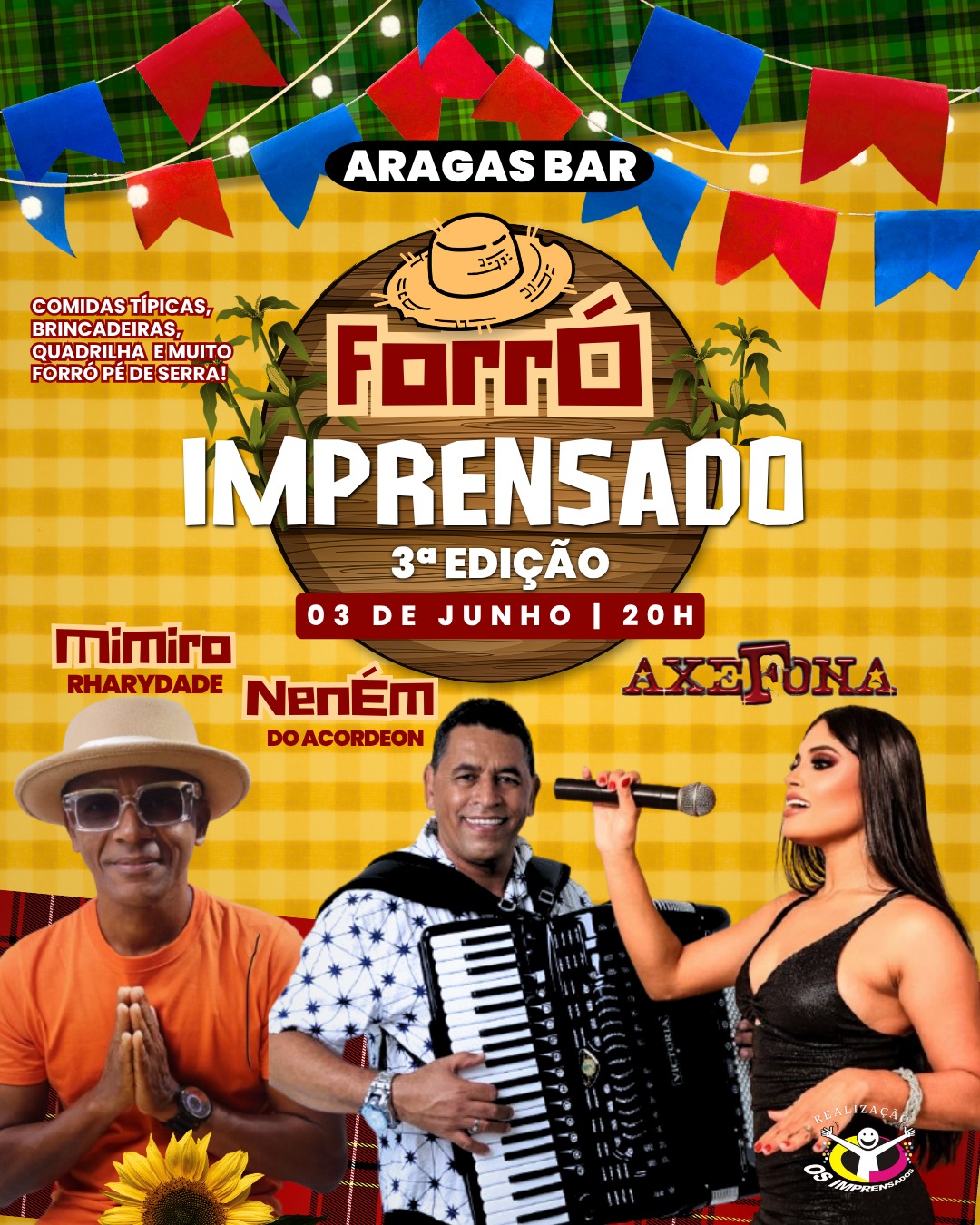 O 3º Forró Imprensado, promovido pelos comunicadores sociais do Grupo Os Imprensados FSA, será realizado no dia 03 de junho deste ano, a partir das 20h, no Aragas Bar, localizado na avenida Fraga Maia, em Feira de Santana-BA.