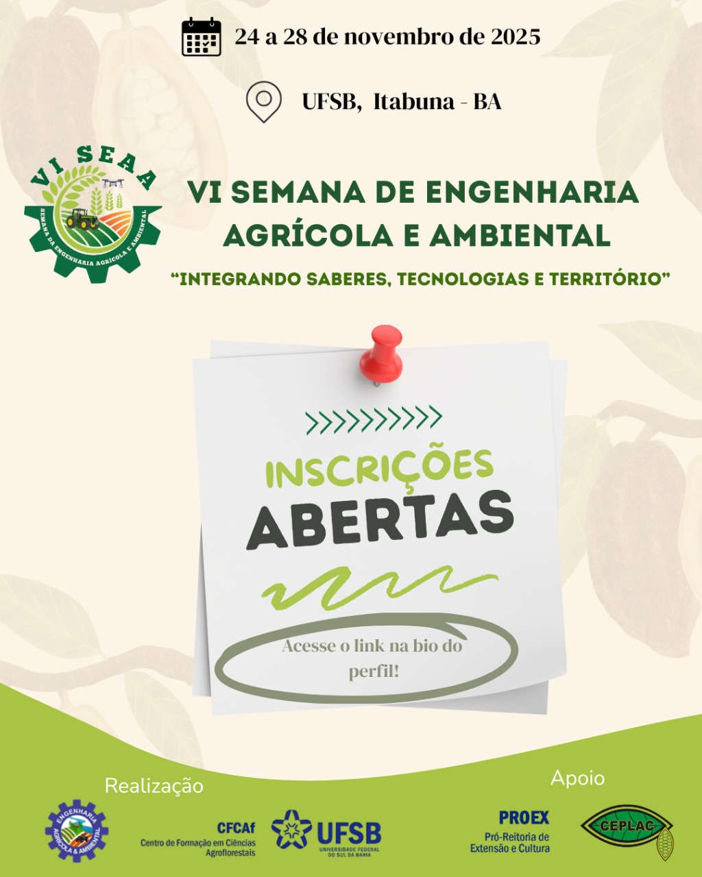 ​A Universidade Federal do Sul da Bahia (UFSB) dá início à VI Semana de Engenharia Agrícola e Ambiental, um evento de grande relevância para a região que se estenderá de 24 a 28 de novembro. Com uma proposta inovadora, a Semana será realizada de forma itinerante, percorrendo diversos municípios do Litoral Sul da Bahia, levando conhecimento e discussão para mais perto das comunidades agrícolas. A iniciativa visa integrar a academia com as práticas e desafios do campo, fomentando o desenvolvimento sustentável e tecnológico da agricultura e pecuária regional.