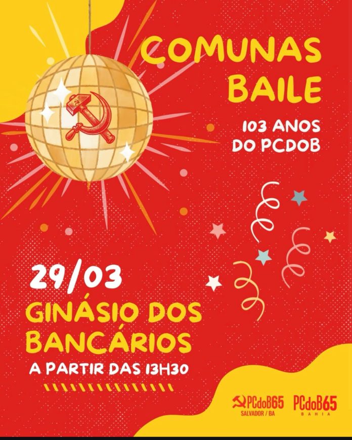 No próximo dia 29, o PCdoB tem a honra de te convidar para o Comunas Baile, em celebração dos 103 anos do Partido Comunista do Brasil. A festa conta com uma grande programação cultural e atividades que serão divulgadas em breve.