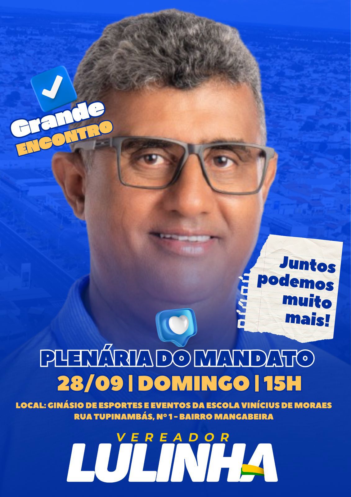 ​O vereador Lulinha está convocando os moradores de Feira de Santana para uma grande reunião geral neste domingo, 28 de setembro, às 15h. Denominado “Plenária do Mandato”, o evento tem como objetivo principal abrir um espaço de diálogo e união entre o parlamentar e a comunidade, reforçando a comunicação direta e transparente.