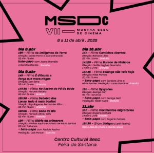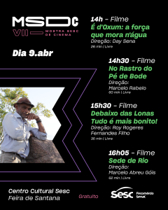 Os filmes que compõem a programação foram avaliados e selecionados por uma comissão estadual formada por profissionais do Sesc e especialistas convidados. As obras selecionadas exploram a grandeza da Bahia, dos baianos e do cinema produzido em nosso estado. Entre as produções estão “As Indígenas da Terra”, “No Rastro do Pé do Bode”, “Diário da Primavera”, “Solange não veio hoje” e “Movimentos migratórios”.